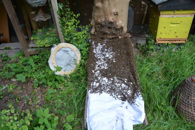 L'essaim se pose lors de ce voyage parfois dans un arbre ou autre, et l'on peut le récupérer dans une ruchette ou un carton, que l'on secouera sur un drap posé devant une ruche nouvelle.