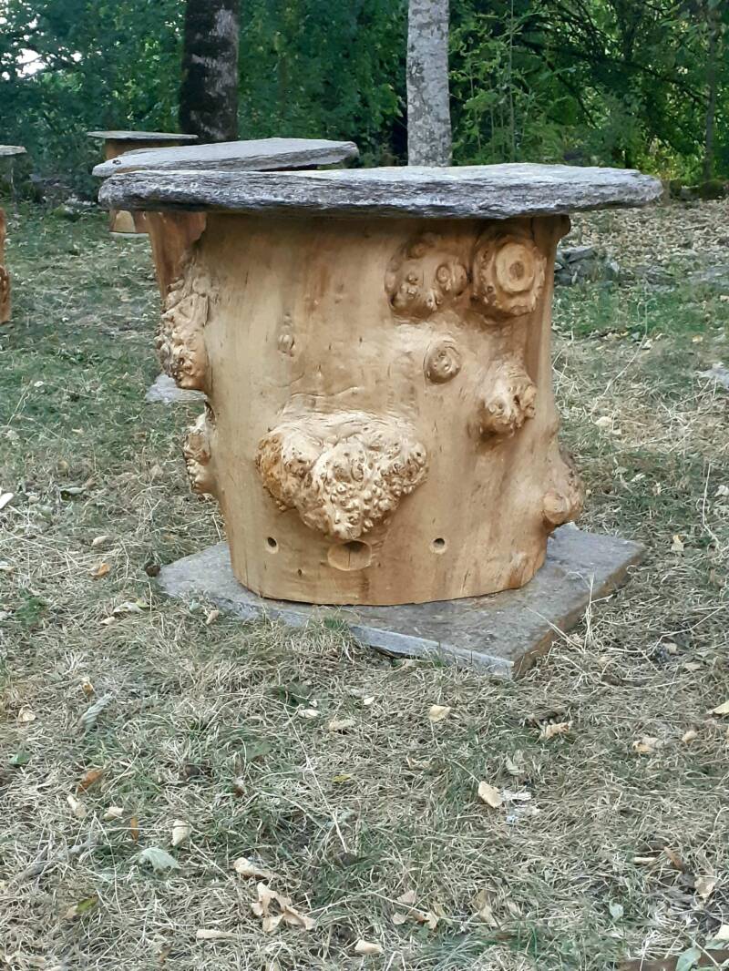 Creusée dans un fût de châtaignier et couverte d'une lauze de schiste taillée, la ruche tronc offre un confort idéal aux abeilles en répondant au mieux à leurs besoins.